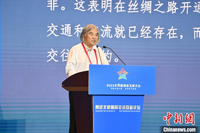 7月18日,2023年中國(guó)網(wǎng)絡(luò)文明大會(huì)網(wǎng)絡(luò)文明國(guó)際交流互鑒論壇在廈門舉辦。圖為絲綢之路考古合作研究中心首席科學(xué)家王建新作主題演講。中新社記者 王東明 攝