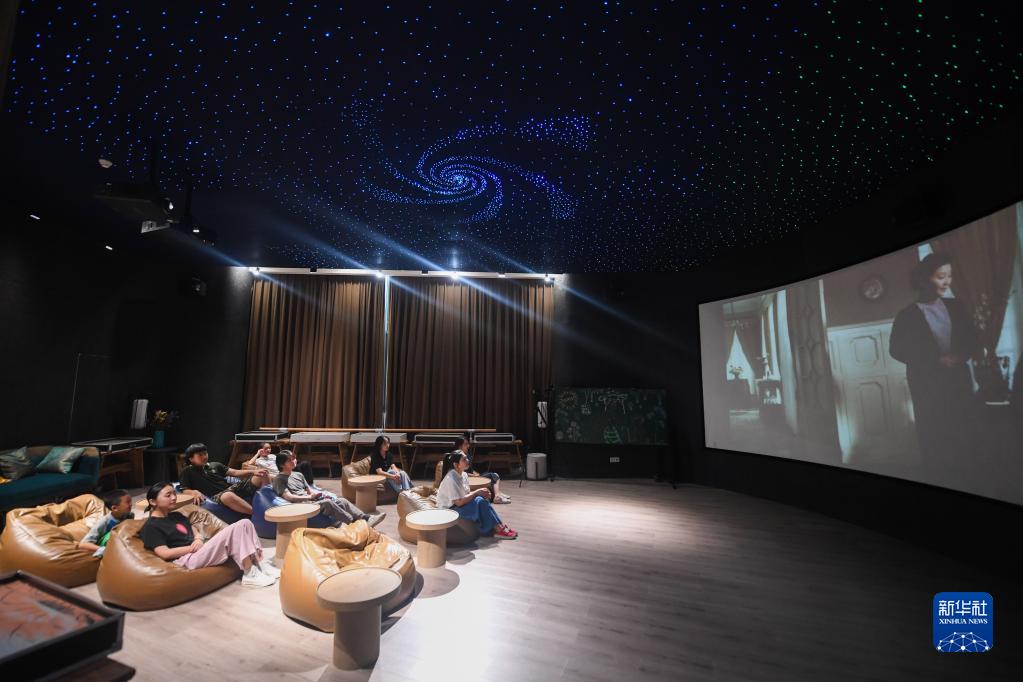 2022年7月2日,居民在位于浙江省杭州市富陽(yáng)區(qū)銀湖街道硅谷社區(qū)的“合之舍”書(shū)房的影視廳內(nèi)觀看電影。該書(shū)房是銀湖街道“15分鐘品質(zhì)文化生活圈”的重要示范點(diǎn)位。新華社記者 徐昱 攝