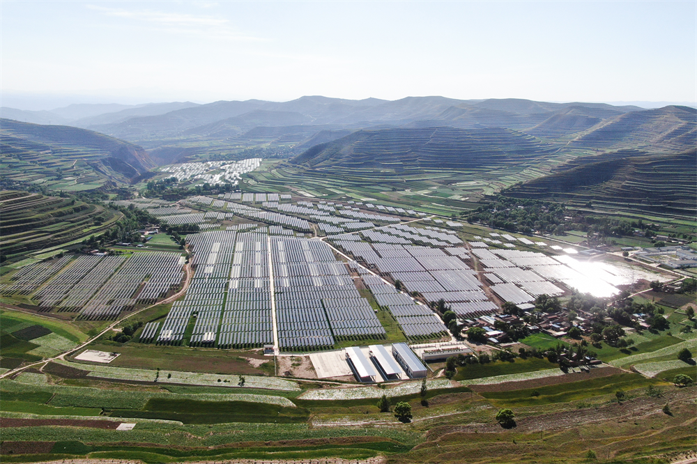 這是2022年6月15日在甘肅省定西市通渭縣榜羅鎮(zhèn)四新村拍攝的集中式光伏電站(無(wú)人機(jī)照片)。新華社記者 馬希平 攝