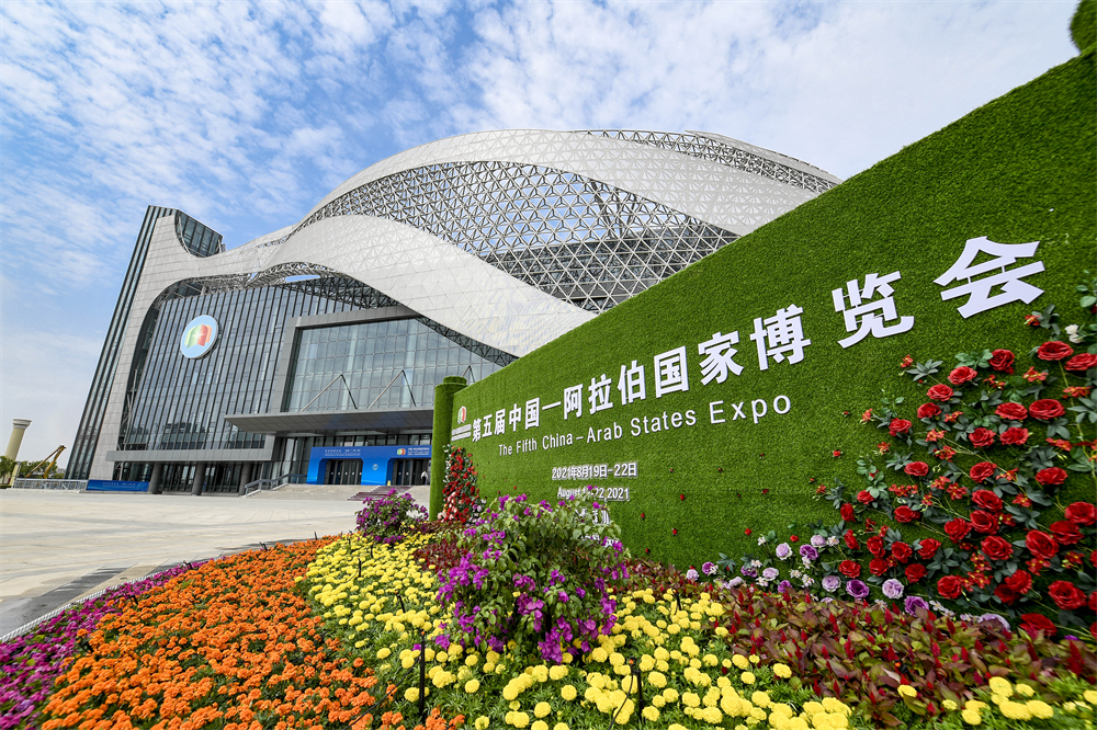 這是2021年8月18日拍攝的第五屆中國(guó)-阿拉伯國(guó)家博覽會(huì)開幕大會(huì)會(huì)址——寧夏國(guó)際會(huì)堂外景。新華社記者 馮開華 攝