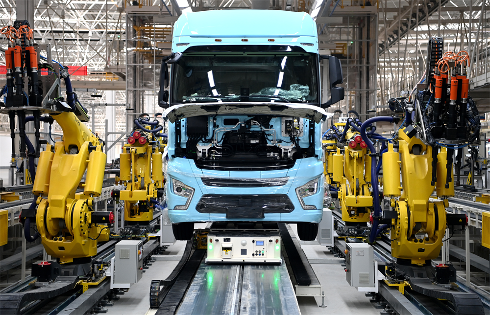 陜西汽車控股集團(tuán)有限公司總裝車間,一輛輛裝配完畢的陜汽重型卡車正等待驗(yàn)收。2022年,陜汽有效克服市場(chǎng)大幅下滑、行業(yè)深度調(diào)整帶來(lái)的挑戰(zhàn),出口訂單累計(jì)超過(guò)4萬(wàn)輛,同比增長(zhǎng)85.51%,創(chuàng)歷史最高水平。