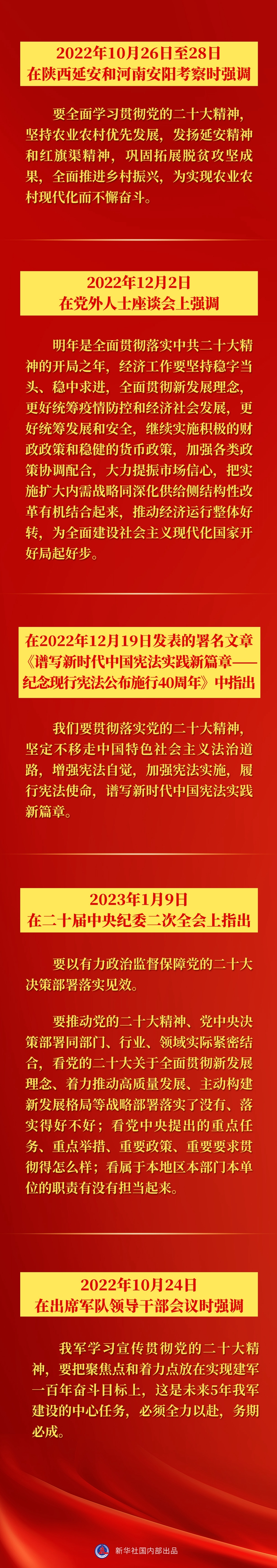 一分部署,九分落實(shí)。黨的二十大以來,針對(duì)各項(xiàng)具體工作,習(xí)近平總書記在多個(gè)場(chǎng)合就學(xué)習(xí)貫徹黨的二十大精神提出要求——