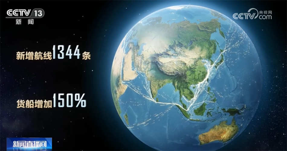 向大海,這是2013年時(shí)中國(guó)與共建“一帶一路”國(guó)家間的水運(yùn)航線。十年間,共建“一帶一路”國(guó)家間的水運(yùn)航線數(shù)量翻了一番,新增航線達(dá)到了1344條,穿梭其中的貨船增加150%?!敖z路海運(yùn)”航線已通達(dá)全球43個(gè)國(guó)家的117個(gè)港口,織出了一張聯(lián)通世界的貿(mào)易流動(dòng)網(wǎng)絡(luò)。