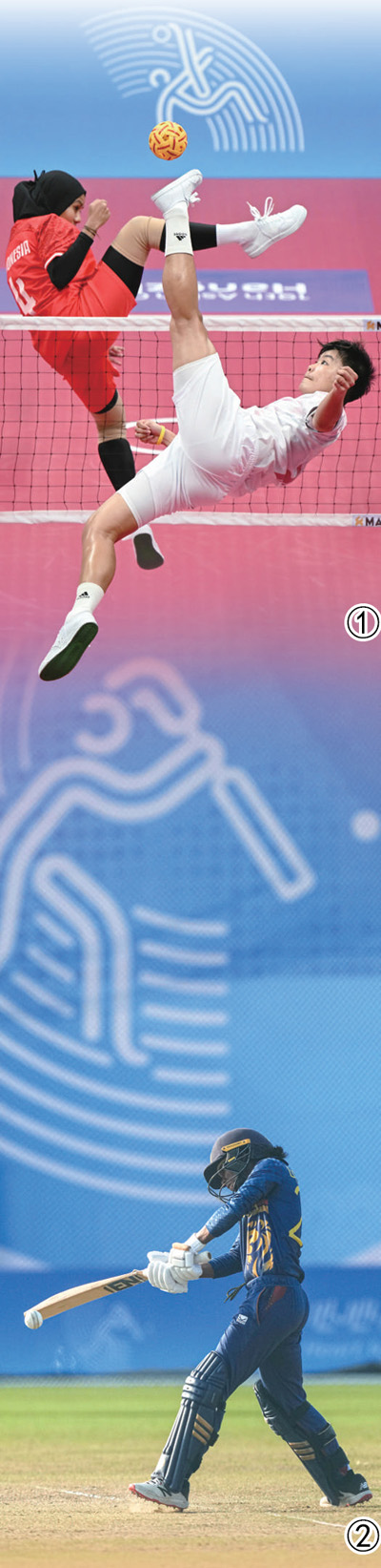 圖①:9月24日,藤球女子單組團體預(yù)選賽,泰國體育代表團選手曼立卡·汶托(前)對陣印度尼西亞體育代表團選手。