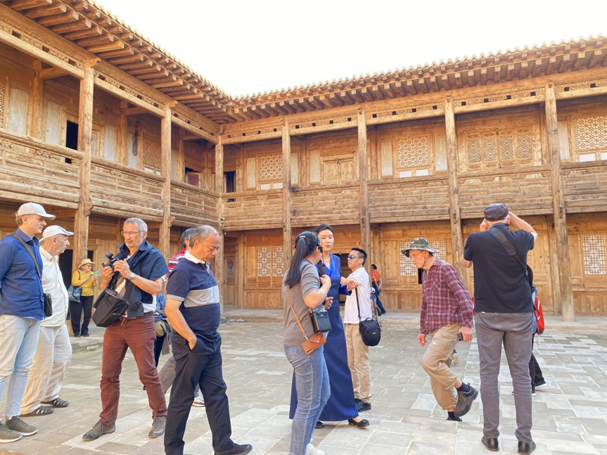中午,調(diào)研組在黃南藏族自治州尖扎縣噶達莊園品嘗了藏族美食??勺匪莅倌隁v史的噶達莊園是當(dāng)?shù)毓爬藗}活佛的故居后花園,園內(nèi)樹木茂密、鳥語花香,海外學(xué)者們紛紛表示,在這個充滿歷史文化氛圍的莊園用餐是一次難忘的體驗。下午,調(diào)研組一行參觀了尖扎縣昂拉鄉(xiāng)昂拉千戶府和昂拉賽康寺。昂拉千戶府始建于清代,1941年重建,1949年竣工。莊園占地面積約4600平方米,是青海省保留比較完整的藏式莊園。該莊院建筑風(fēng)格獨特,前院用木質(zhì)結(jié)構(gòu)建造,后院用土木結(jié)構(gòu)建造,其整體建筑風(fēng)格采用了漢式山水元素。