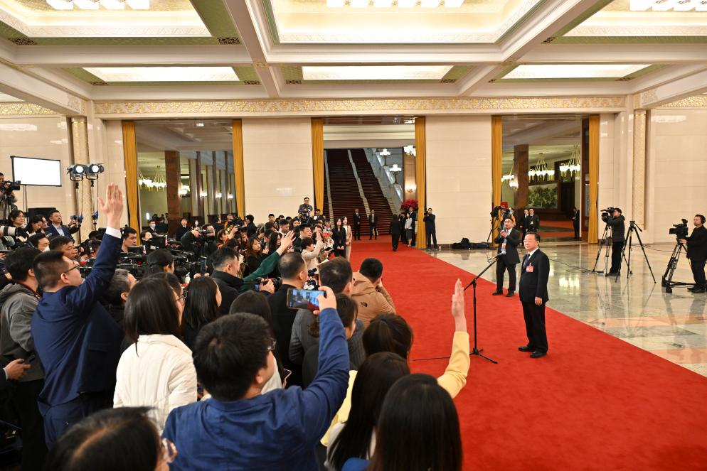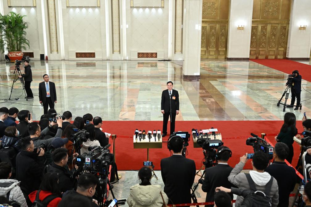 3月5日,第十四屆全國人民代表大會第二次會議首場“部長通道”集中采訪活動在北京人民大會堂舉行。這是水利部部長李國英接受媒體采訪。新華社記者 牟宇 攝