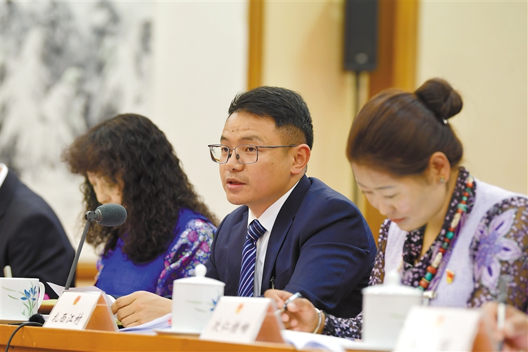 3月5日下午,十四屆全國人大二次會(huì)議西藏代表團(tuán)舉行全體會(huì)議,審議政府工作報(bào)告。圖為來自隆子縣斗玉珞巴民族鄉(xiāng)的全國人大代表扎西江村在西藏代表團(tuán)審議時(shí)發(fā)言。記者 旦增西旦 攝