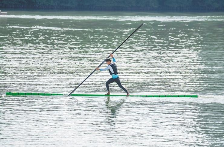 “獨(dú)竹漂是一項由運(yùn)動員赤足站立在漂浮于水面的單根竹子,利用手中的劃竿劃水前進(jìn),以同等的距離內(nèi)所用的時間多少決定名次的運(yùn)動項目?!边\(yùn)動會海南代表隊水上運(yùn)動項目教練員王云富介紹。