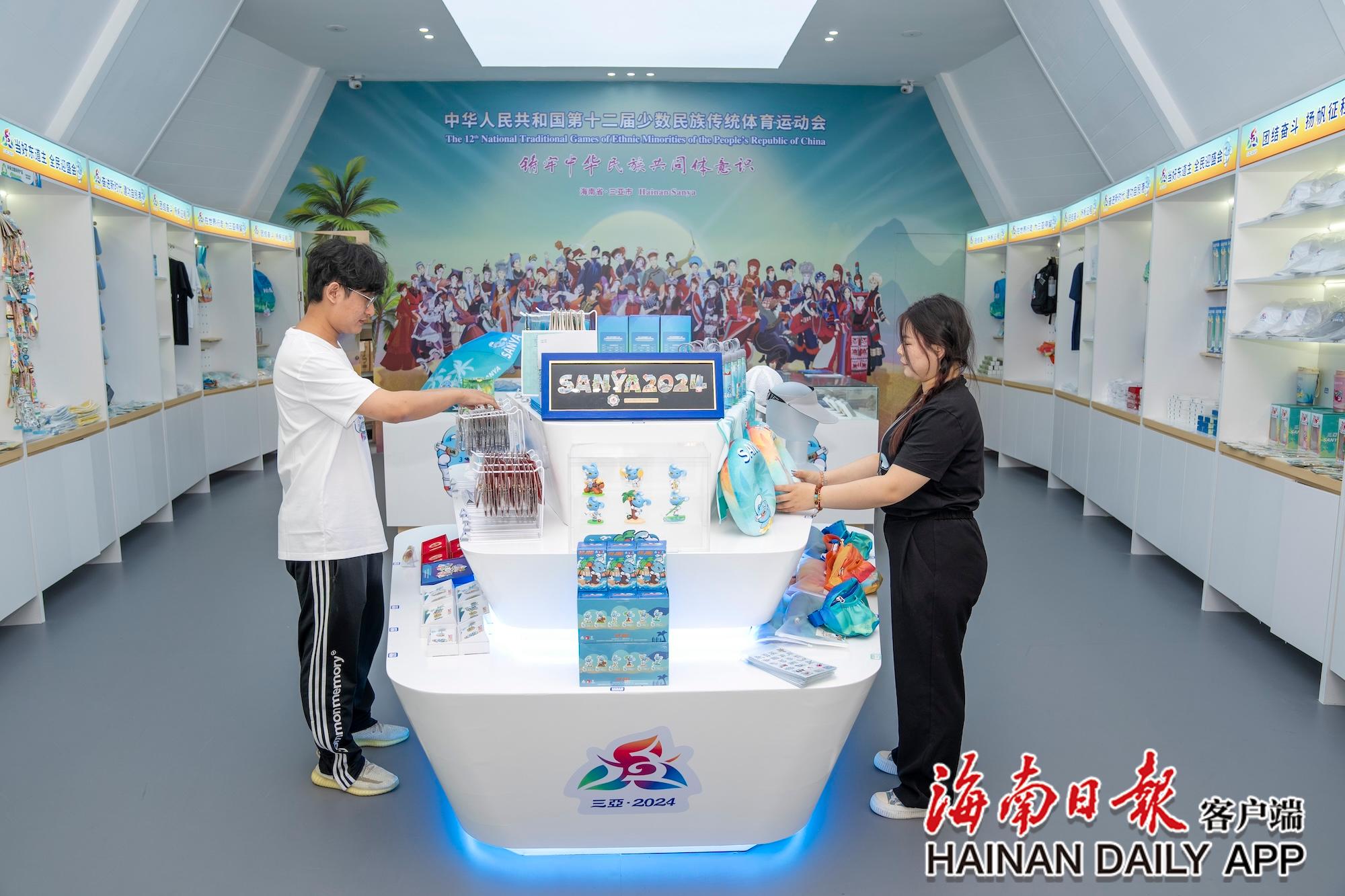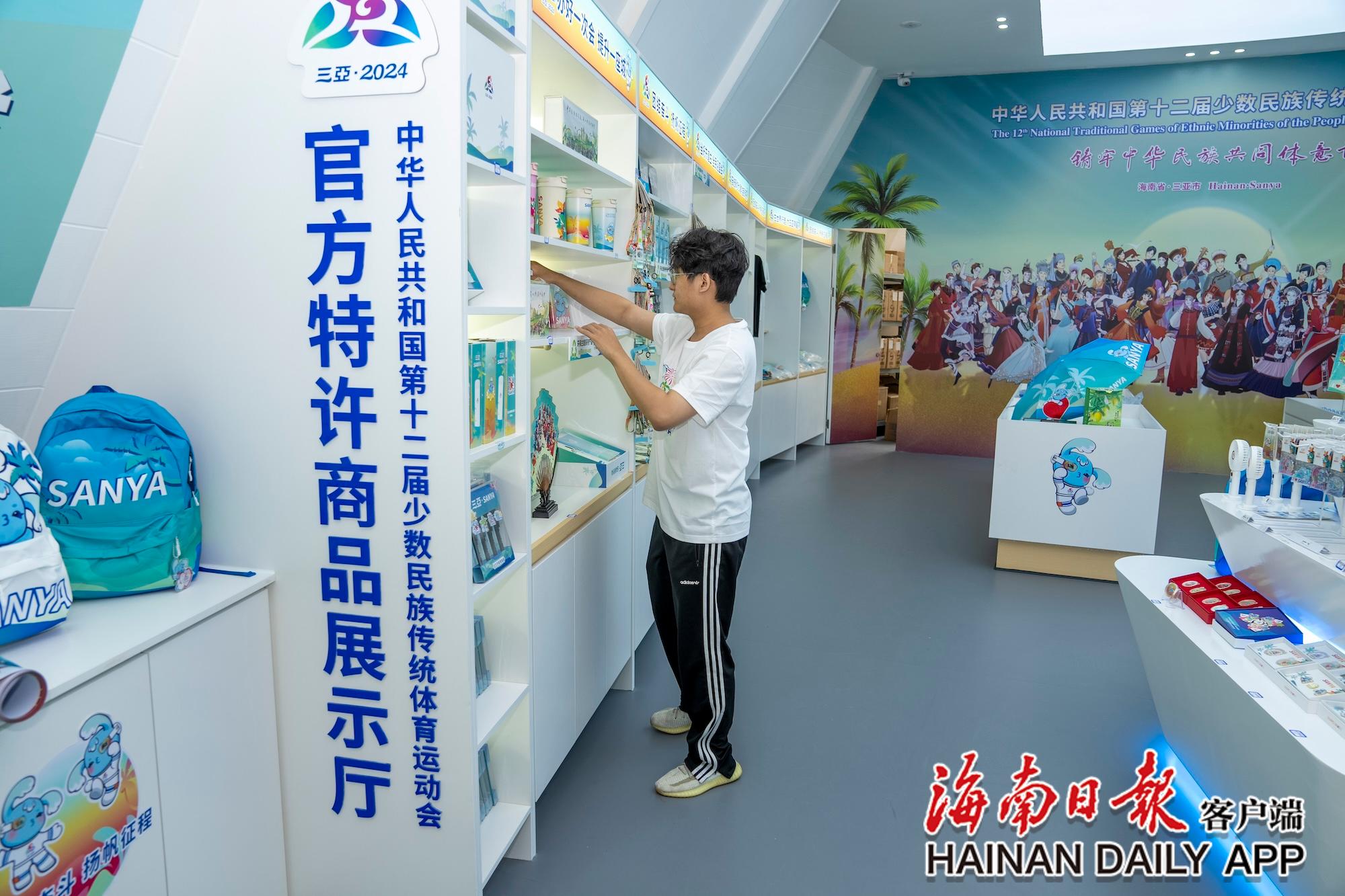 11月8日,在三亞灣紅樹(shù)林度假世界的運(yùn)動(dòng)會(huì)官方特許商品展示廳內(nèi),工作人員擺放運(yùn)動(dòng)會(huì)特許商品。海南日?qǐng)?bào)全媒體記者 李天平 攝
