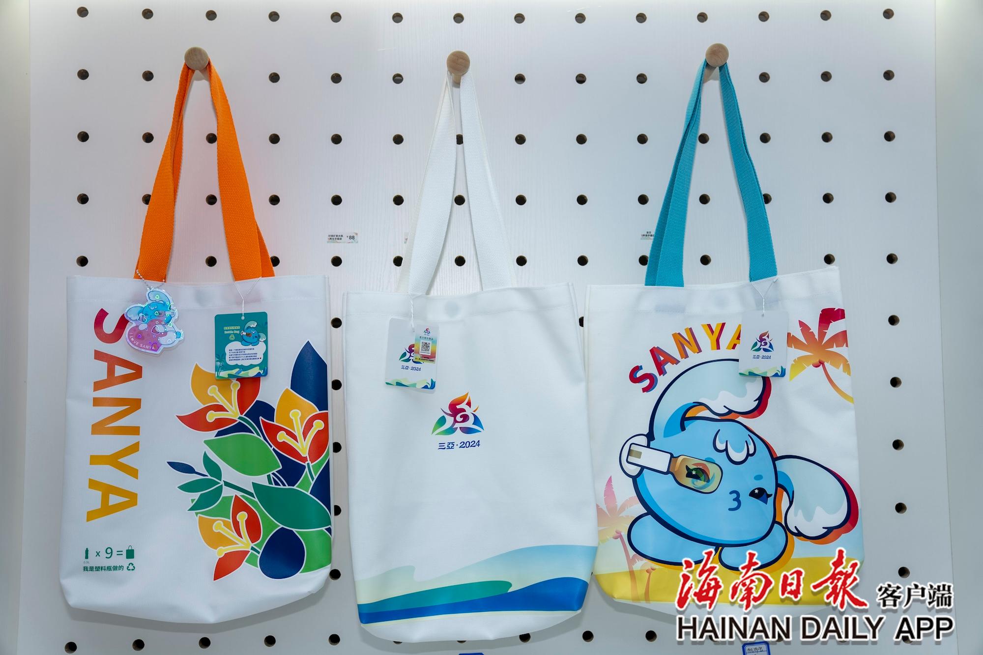 11月8日,三亞灣紅樹(shù)林度假世界的運(yùn)動(dòng)會(huì)官方特許商品展示廳內(nèi)的環(huán)保礦泉水瓶再生手提袋。海南日?qǐng)?bào)全媒體記者 李天平 攝