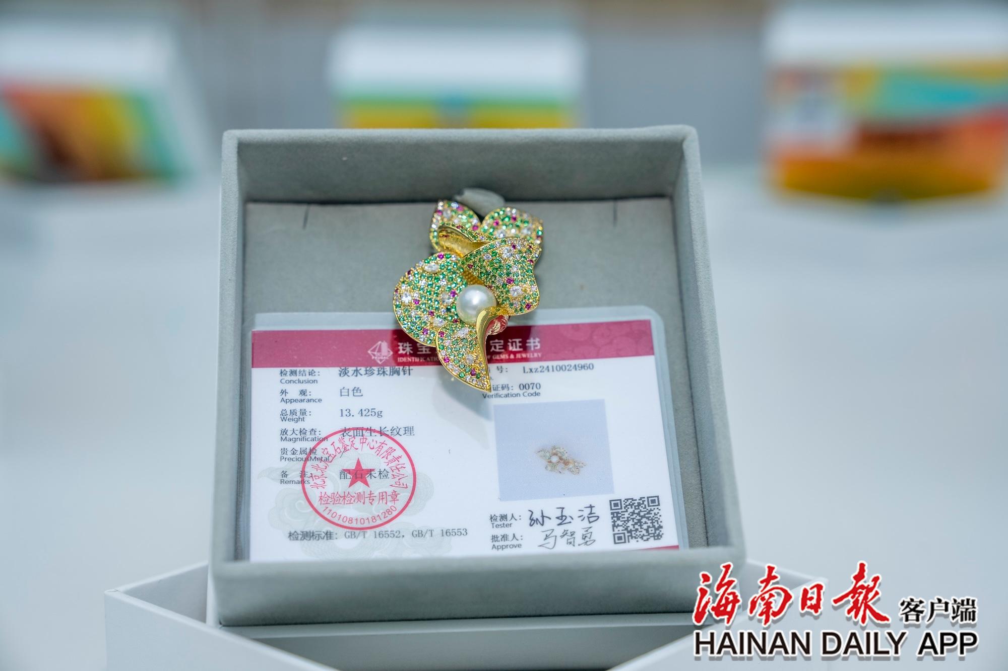 11月8日,三亞灣紅樹(shù)林度假世界的運(yùn)動(dòng)會(huì)官方特許商品展示廳內(nèi)的淡水珍珠胸針。海南日?qǐng)?bào)全媒體記者 李天平 攝