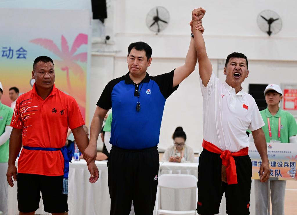 27日,第十二屆全國少數(shù)民族傳統(tǒng)體育運動會(以下簡稱“運動會”)押加比賽迎來五個組別的最終爭奪。新疆生產(chǎn)建設(shè)兵團選手提亞那克驚險取勝,獲得85公斤級一等獎。一場鏖戰(zhàn)后,他與來自海南的選手吉航敬擁抱致意。