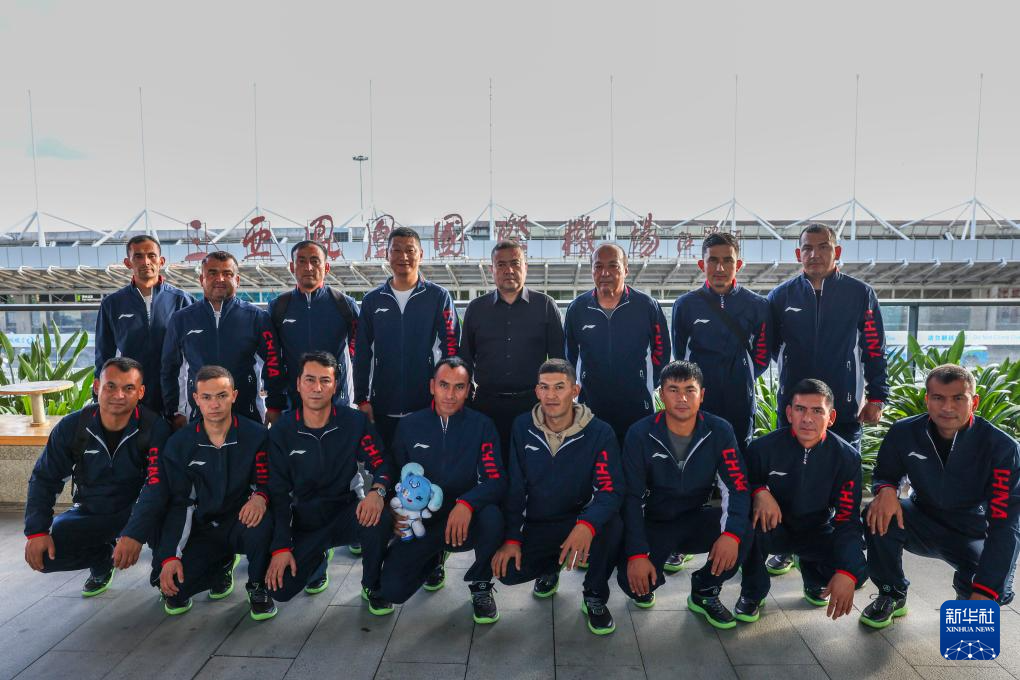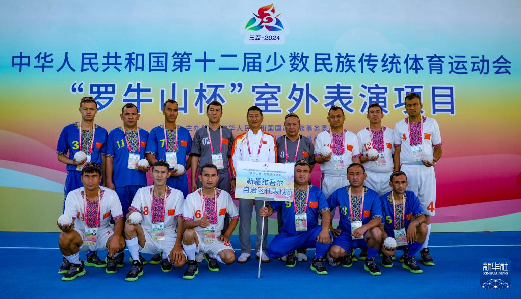 這是11月24日,在三亞市體育中心,新疆麥熱球隊(duì)成員在第十二屆全國少數(shù)民族傳統(tǒng)體育運(yùn)動(dòng)會室外表演項(xiàng)目開始前合影。