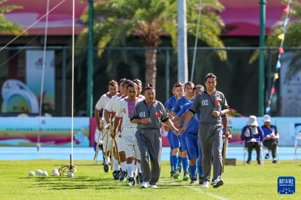 這是11月24日,在三亞市體育中心舉行的第十二屆全國少數(shù)民族傳統(tǒng)體育運(yùn)動(dòng)會室外表演項(xiàng)目中,新疆麥熱球隊(duì)隊(duì)員入場。