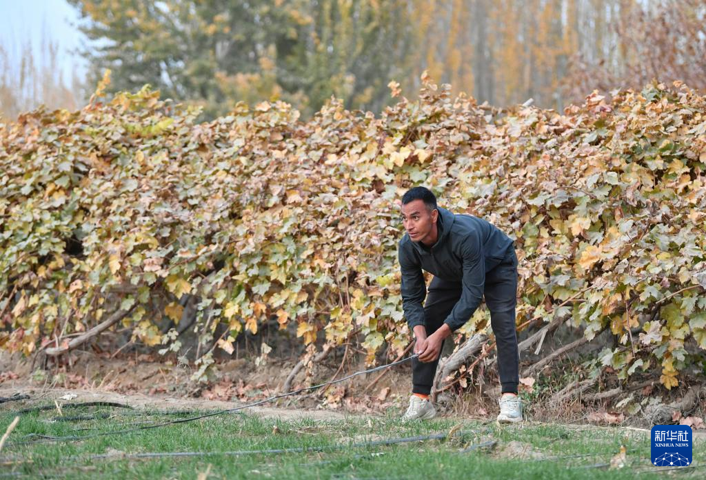 這是11月8日,在新疆于田縣先拜巴扎鎮(zhèn)薩依巴格村,阿卜杜拉艾孜則·阿卜杜海娃爾在冬小麥田間檢查滴灌帶。