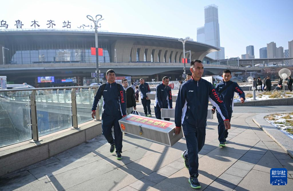 這是11月17日,阿卜杜拉艾孜則·阿卜杜海娃爾(前右)和隊(duì)友攜帶比賽裝備從于田抵達(dá)烏魯木齊站。