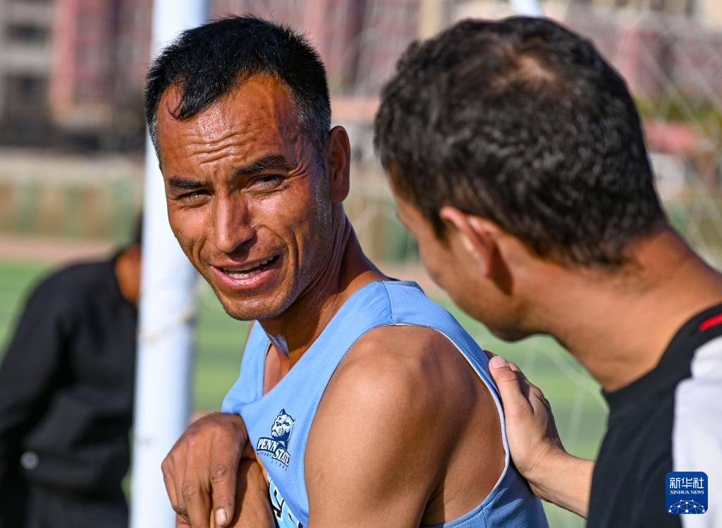 這是11月8日,在新疆于田縣體育場,阿卜杜拉艾孜則·阿卜杜海娃爾(左)在訓(xùn)練后和隊(duì)友交流。