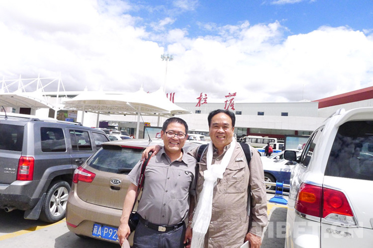 圖為時(shí)任中央人民廣播電臺(tái)、中國國際廣播電臺(tái)西藏記者站站長、現(xiàn)任中央廣播電視總臺(tái)西藏總站站長曾曉東到拉薩機(jī)場迎接。攝影 張?zhí)一?/p>