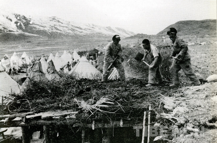 圖為1951年4月,修建簡易機(jī)場時(shí),戰(zhàn)士們在搭建住宿帳篷和簡易房 。