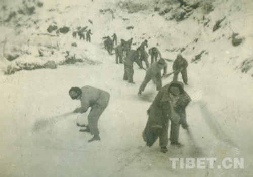 圖為戰(zhàn)士在二郎山清掃道路上的雪 攝于1951年