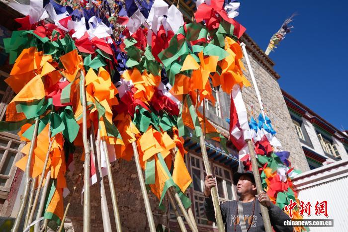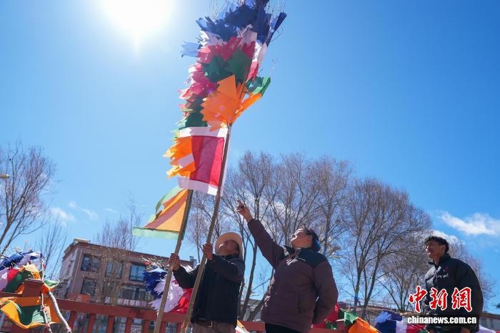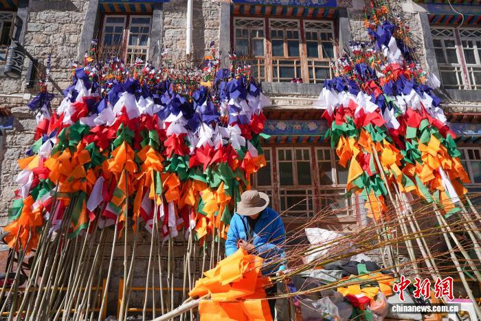 2月5日,臨近藏歷新年,在西藏自治區(qū)拉薩市街頭,農(nóng)牧民正縫制五彩經(jīng)幡樹。五彩經(jīng)幡樹是藏族民眾在藏歷新年前必備的年貨之一。藏歷新年期間,藏族民眾會選擇一個良辰吉日,為自家的房頂更換五彩經(jīng)幡樹,祈求新的一年里五谷豐登,吉祥如意。