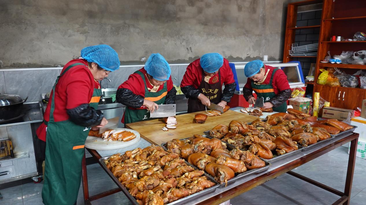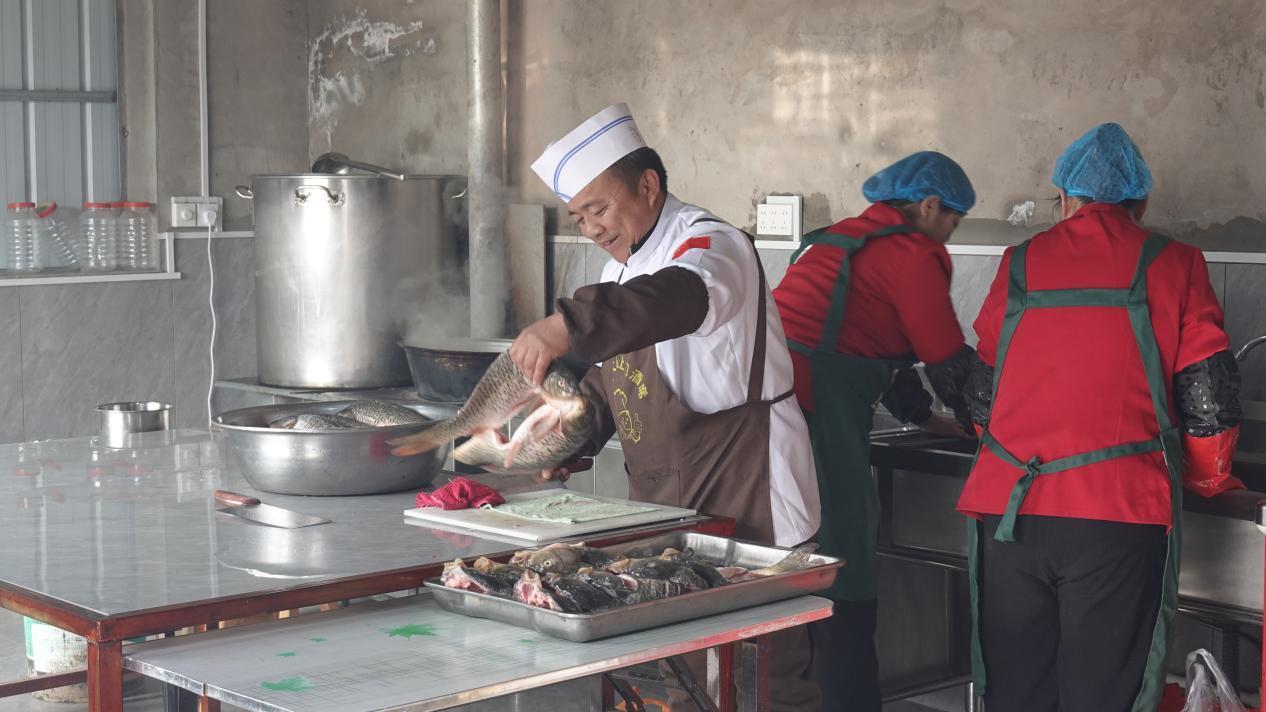 食材加工間里,村民蔣淑芳正在仔細刷豬蹄,她是團隊里的老人了。這份工作,她很知足,工資每月多的時候能掙四五千。負責切菜的漫玉也是南屯村人,今年55歲,她原本在城里的餐廳打工,去年底為了照顧生病的哥哥,辭工回了家,也加入了鞏大廚的團隊。