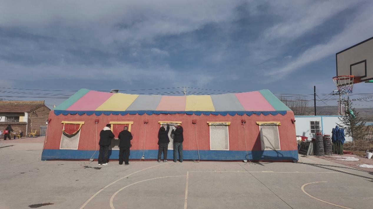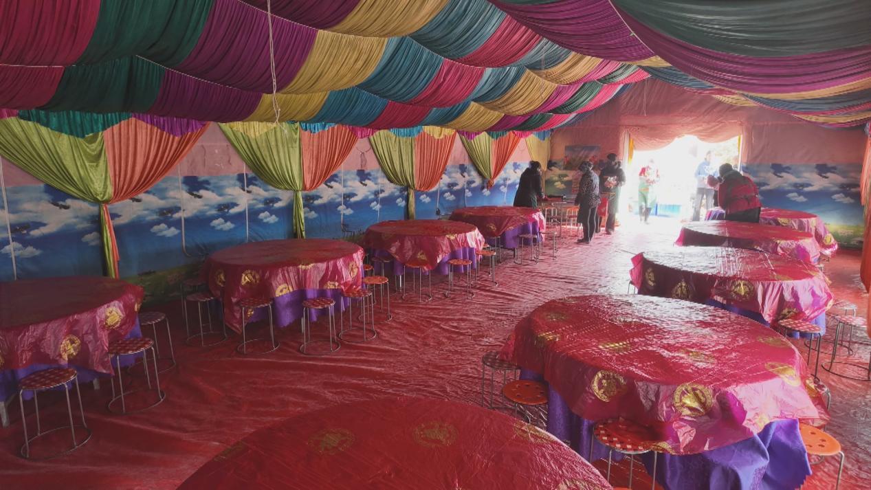 兩個小時后,導航準確地把他們帶到了許溝村六組的村組活動場。第二天的宴席就在這兒辦。水泥地面平整開闊,旁邊有一個搭建好的、可以提供電源的門房,爐火燒得正旺,是辦席的好場子。