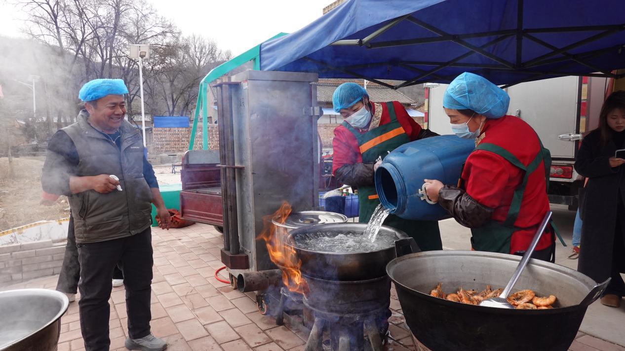 大家一起動手,不到半小時,一個大約一百平方米的移動帳篷宴會廳平地而起,配套的桌椅、桌布、取暖設(shè)備和照明電燈等一樣不少。鍋灶、煤氣爐、蒸箱一字排開,就在帳篷門口,真正“明廚亮灶”。備好了大件,大家開始洗青菜、擇菜,這些當天現(xiàn)弄才新鮮。