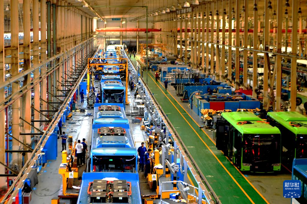這是繁忙的廈門金龍客車總裝車間(2022年6月22日攝)。