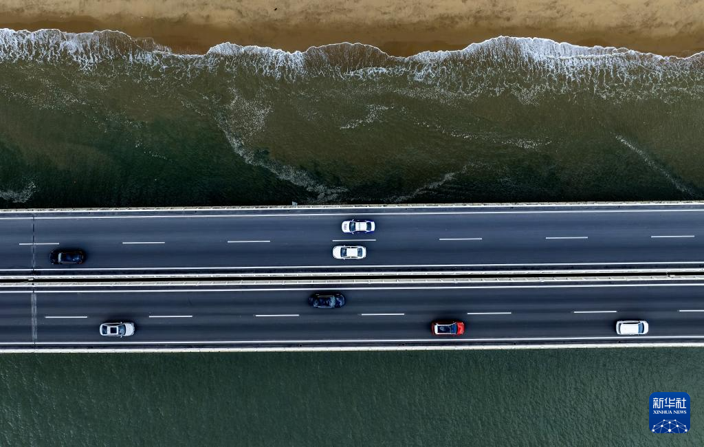 車輛行駛在廈門市演武大橋上。橋下,層層疊疊的海浪拍打著沙灘(9月4日攝,無人機(jī)照片)。