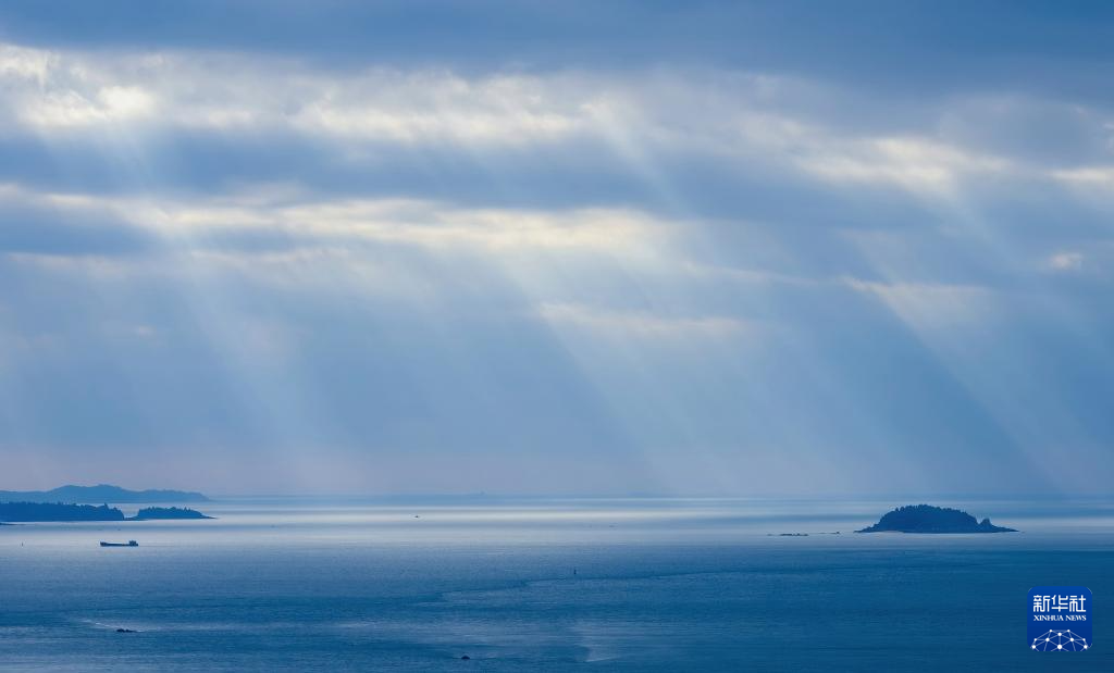 在廈門市演武大橋附近,光線穿過云層,灑落在海面和周邊小島上(9月4日攝,無人機(jī)照片)。