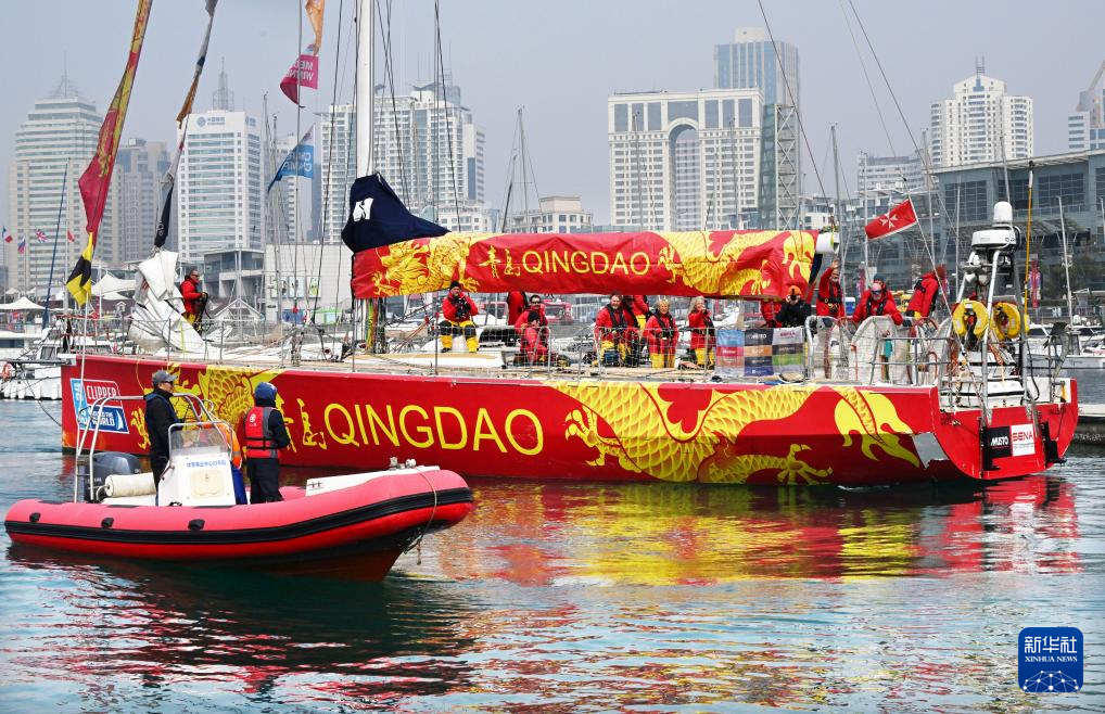 參加2023-24克利伯環(huán)球帆船賽的青島號大帆船抵達青島奧林匹克帆船中心(3月22日攝)。