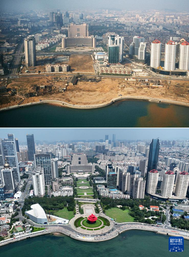 這是一張拼版照片。上圖為1996年拍攝的建設中的青島五四廣場(青島市委宣傳部供圖),下圖為鳥瞰青島五四廣場景色(8月17日新華社記者李紫恒攝,無人機照片)。