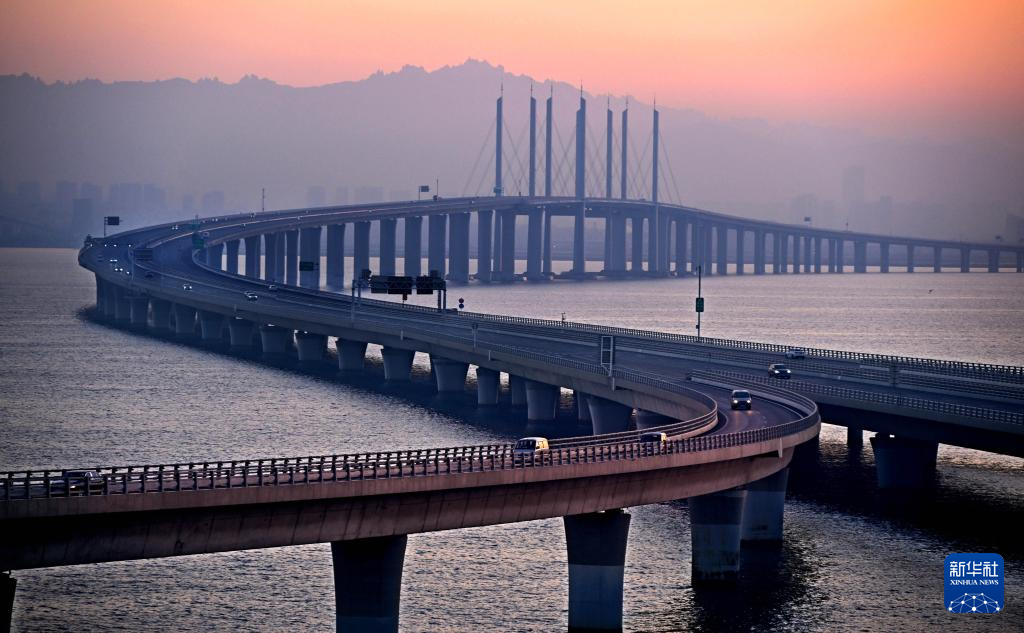 車輛行駛在青島膠州灣跨海大橋上(1月1日攝)。