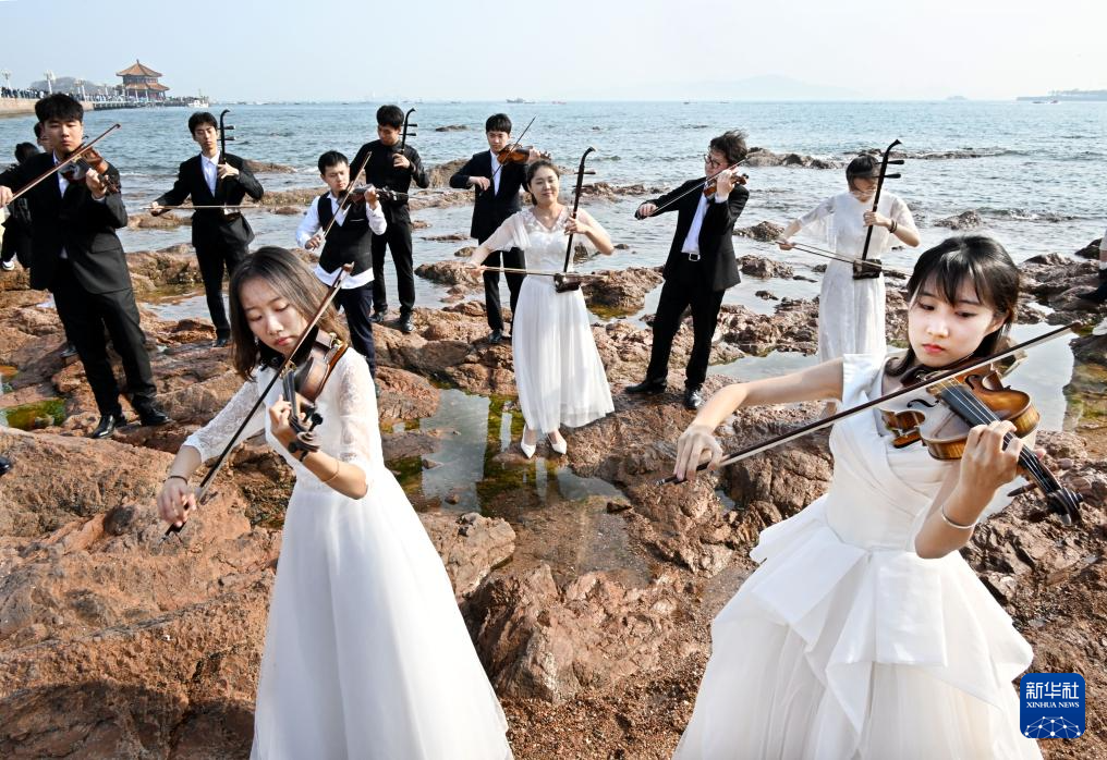 中國海洋大學藝術系學生在青島市市南區(qū)棧橋景區(qū)演奏(4月18日攝)。