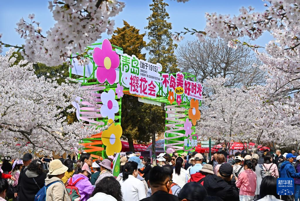人們在青島中山公園觀賞櫻花(4月11日攝)。