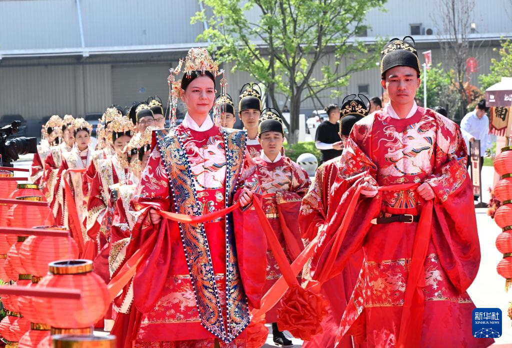 新人在青島市嶗山區(qū)新時代文明實踐廣場參加集體婚禮(5月9日攝)。