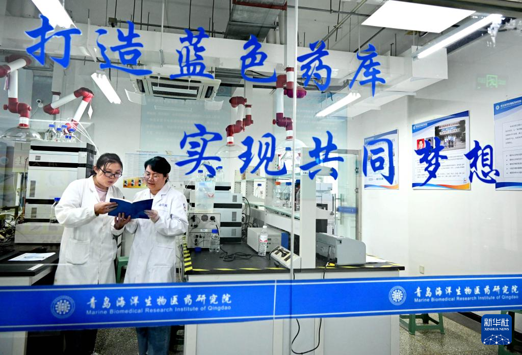 青島海洋生物醫(yī)藥研究院兩名科研人員在實驗室交流(6月7日攝)。