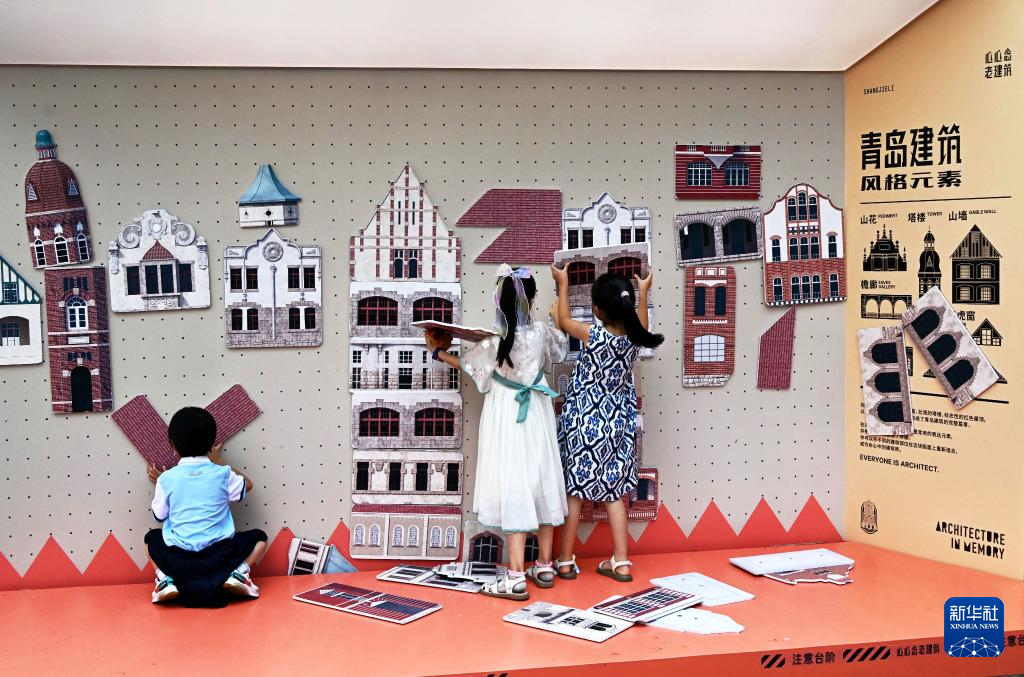 幾名小朋友在青島市南區(qū)中山路一街頭文化亭內玩耍(8月17日攝)。