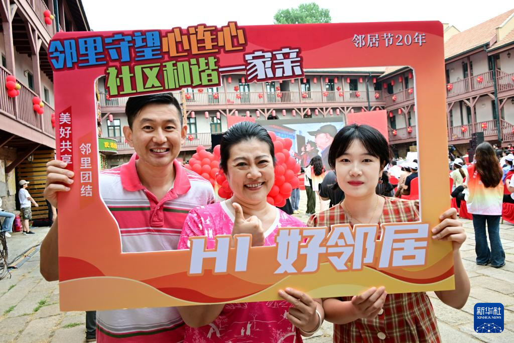 市民在青島鄰居節(jié)20周年系列活動啟動儀式上合影(6月17日攝)。