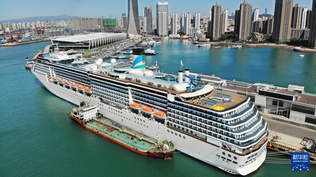 巴哈馬籍“愛達·地中?!碧栢]輪靠泊山東青島國際郵輪母港(6月27日攝,無人機照片)。