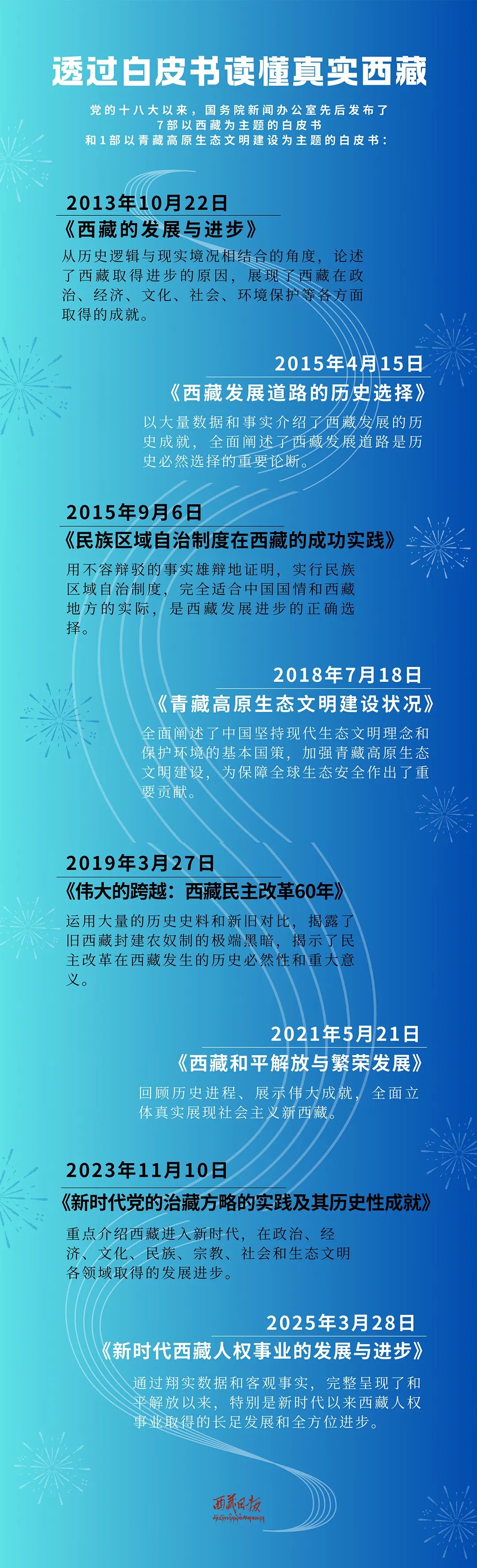 例如,2015年發(fā)布《西藏發(fā)展道路的歷史選擇》《民族區(qū)域自治制度在西藏的成功實(shí)踐》兩部白皮書,該年是西藏自治區(qū)成立50周年;2019年發(fā)布《偉大的跨越:西藏民主改革60年》白皮書,該年是西藏民主改革60周年;2021年發(fā)布《西藏和平解放與繁榮發(fā)展》白皮書,該年是西藏和平解放70周年;2025年發(fā)布《新時(shí)代西藏人權(quán)事業(yè)的發(fā)展與進(jìn)步》白皮書,該年是西藏自治區(qū)成立60周年。