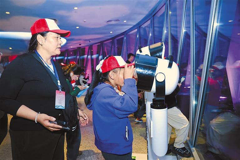 圖為參加冬令營研學(xué)交流活動的波密少先隊員在廣州塔用共享望遠(yuǎn)鏡眺望廣州城市夜景。記者 謝筱純 攝