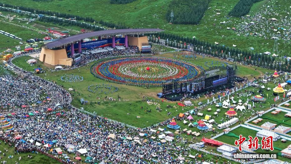圖為開幕式現(xiàn)場“萬人鍋莊”表演。(無人機(jī)照片)中新社記者 九美旦增 攝