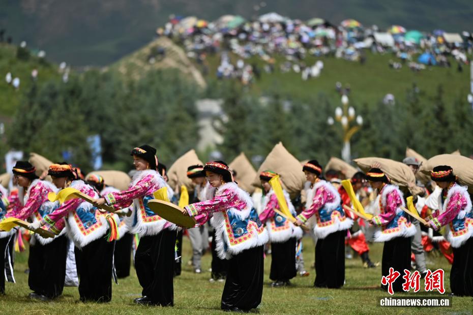 圖為開幕式現(xiàn)場“萬人鍋莊”表演。中新社記者 九美旦增 攝