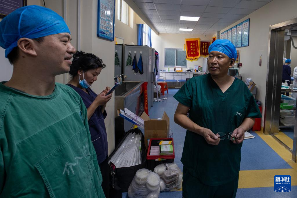 福建省泉州市惠安縣醫(yī)院援藏外科醫(yī)生張聰林(左二)和安溪縣醫(yī)院援藏外科醫(yī)生鄭毓能(左一)在和西藏昌都市洛隆縣醫(yī)院醫(yī)生巴桑扎西(右二)和格桑多布杰(右一)商討患者病情。新華社記者 晉美多吉 攝