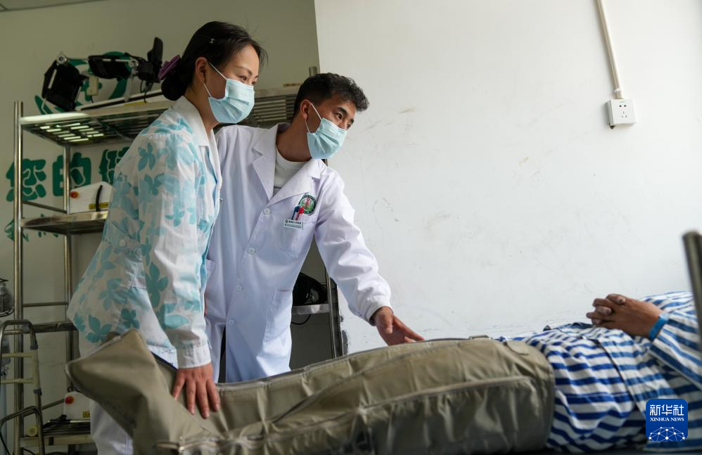 在昌都市洛隆縣人民醫(yī)院,從西藏大學(xué)醫(yī)學(xué)院畢業(yè)的醫(yī)生巴桑扎西和護(hù)士為患者進(jìn)行康復(fù)治療(7月21日攝)。新華社記者 晉美多吉 攝 ??