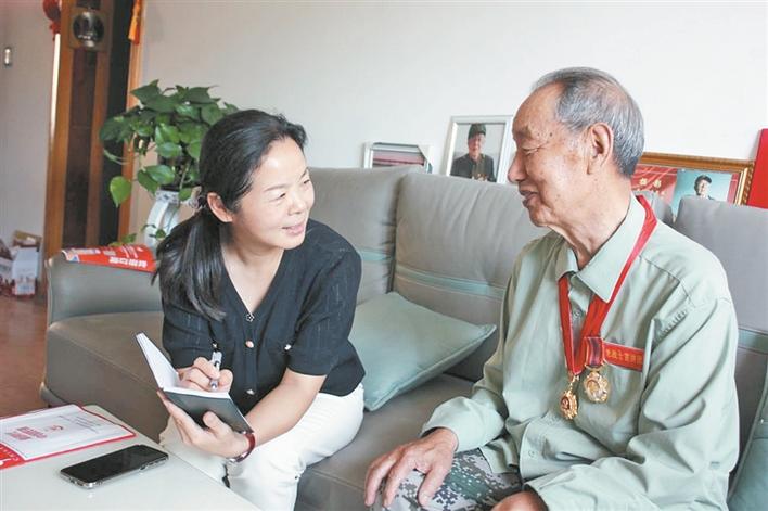 四師可克達拉市融媒體中心記者在采訪四師六十六團老戰(zhàn)士宣講團成員趙文秋(右)(攝于8月20日)。閆欣秋 攝