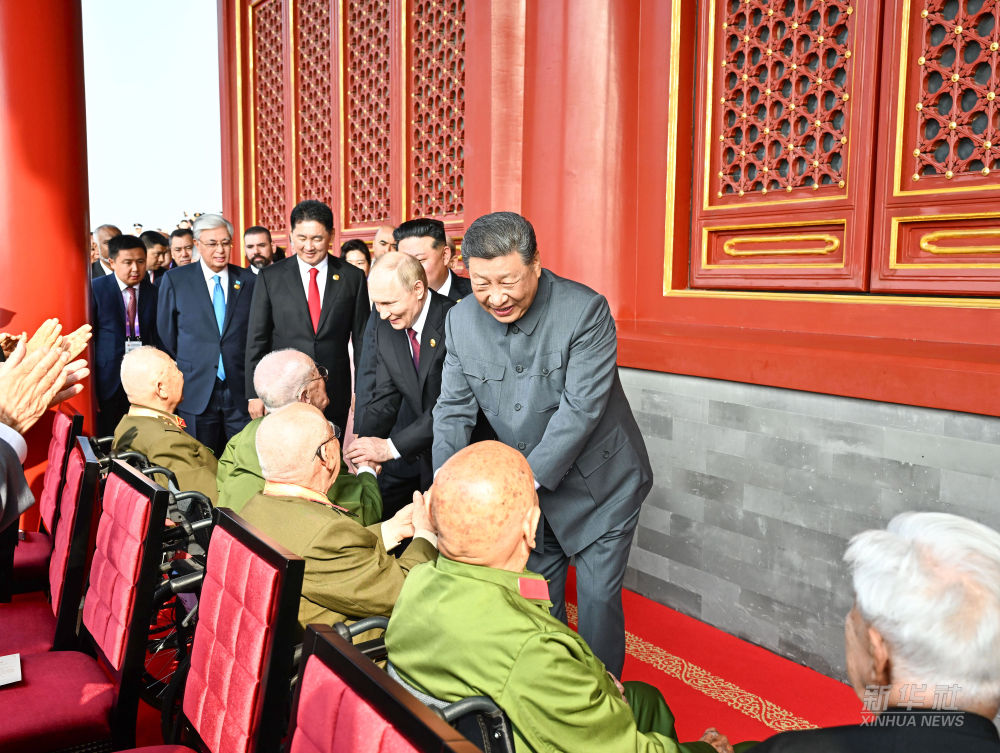 9月3日上午,習(xí)近平等登上天安門(mén)城樓。習(xí)近平同抗戰(zhàn)老戰(zhàn)士老同志代表親切握手,向他們表示崇高敬意。