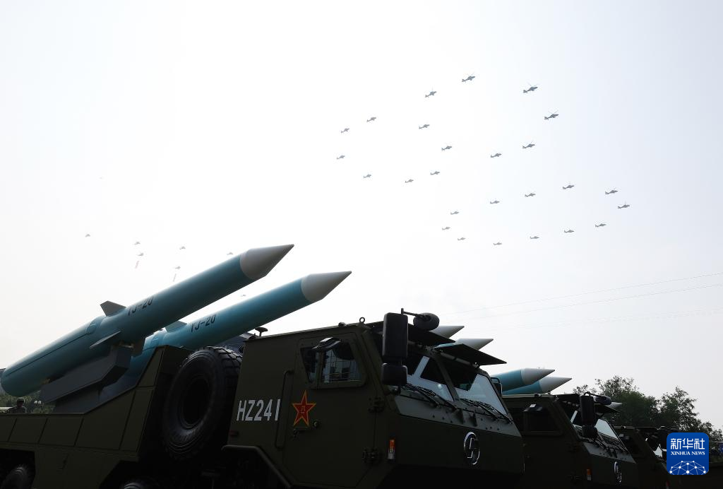9月3日,紀念中國人民抗日戰(zhàn)爭暨世界反法西斯戰(zhàn)爭勝利80周年大會在北京隆重舉行。這是空中護旗梯隊從反艦導(dǎo)彈方隊上空飛過。